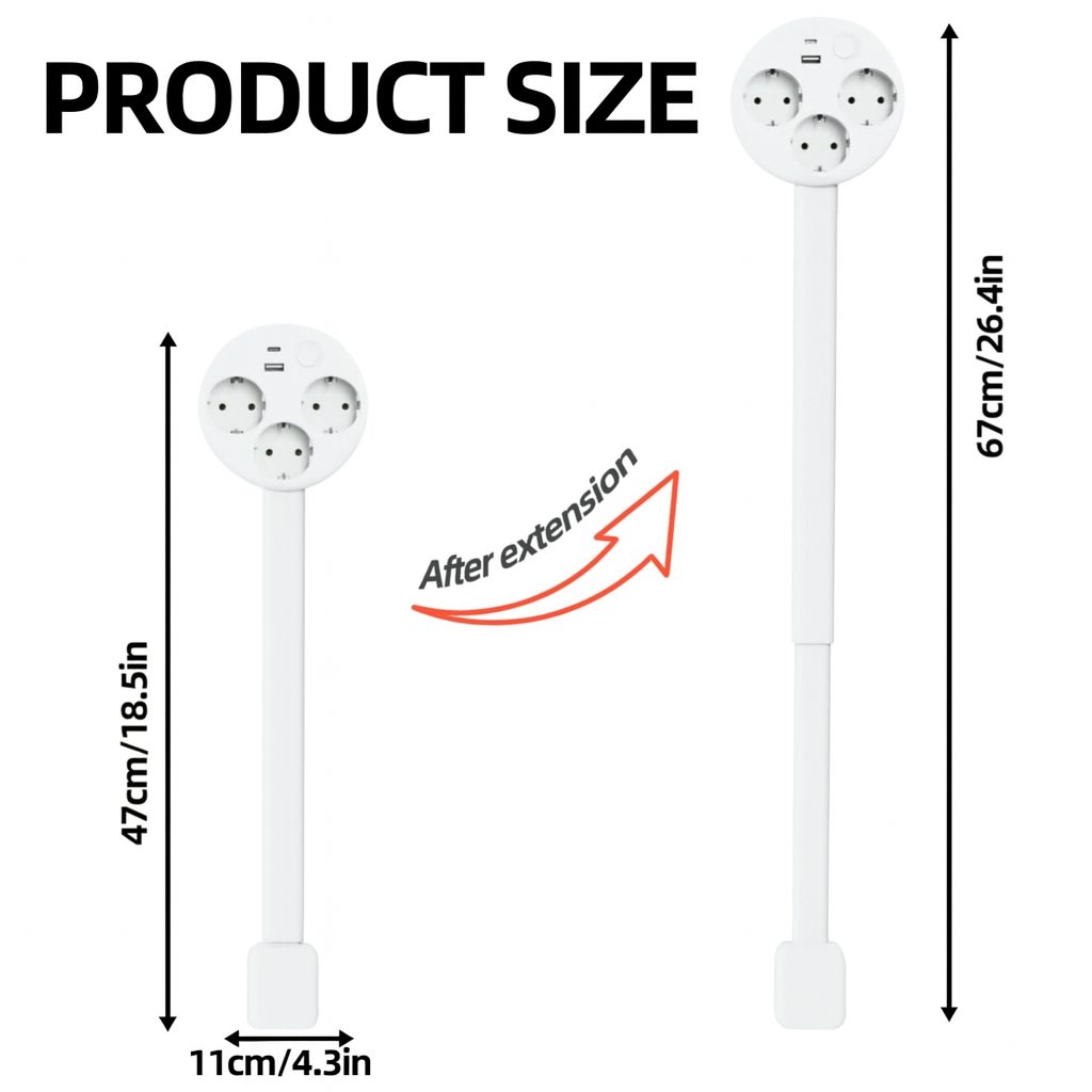 Esta extensão inovadora conecta-se diretamente à tomada de parede e possui um braço ajustável e rotativo, permitindo posicionar as entradas elétricas na altura e no ângulo mais conveniente para si.